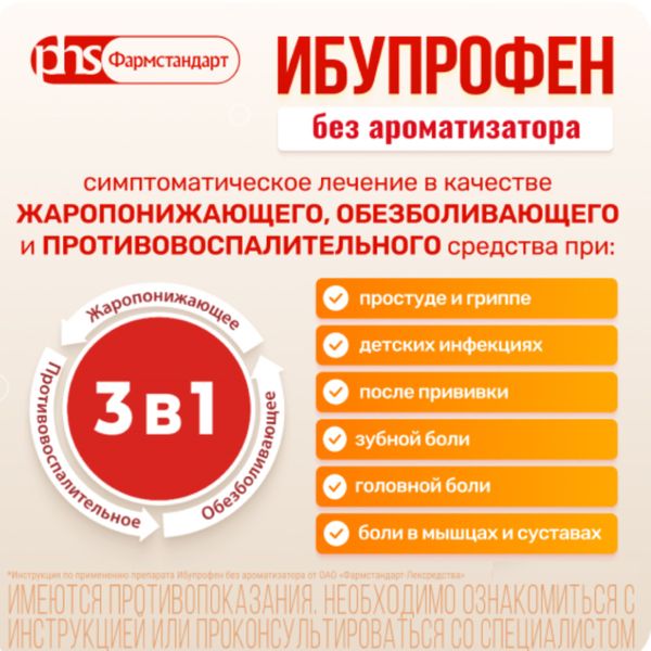 Абсорбция — высокая, быстро и практически полностью всасывается из желудочно-кишечного тракта (ЖКТ) (связь с белками плазмы крови — 90 ;%). После приёма препарата натощак у взрослых ибупрофен обнаруживается в плазме крови через 15 ;минут, максимальная концентрация (Cmax) ибупрофена в плазме крови достигается через 60 ;минут.