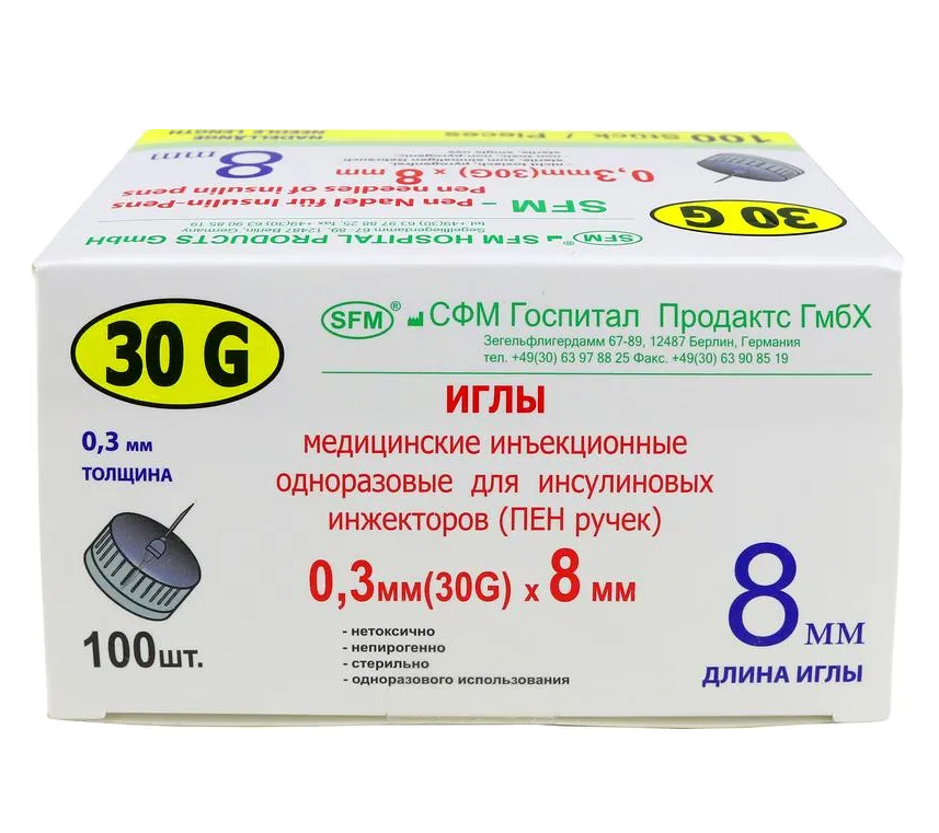 Иглы медицинские инъекционные одноразовые для инсулиновых инжекторов (ПЕН ручек) 30G (0,30ммх8мм) SFM №100