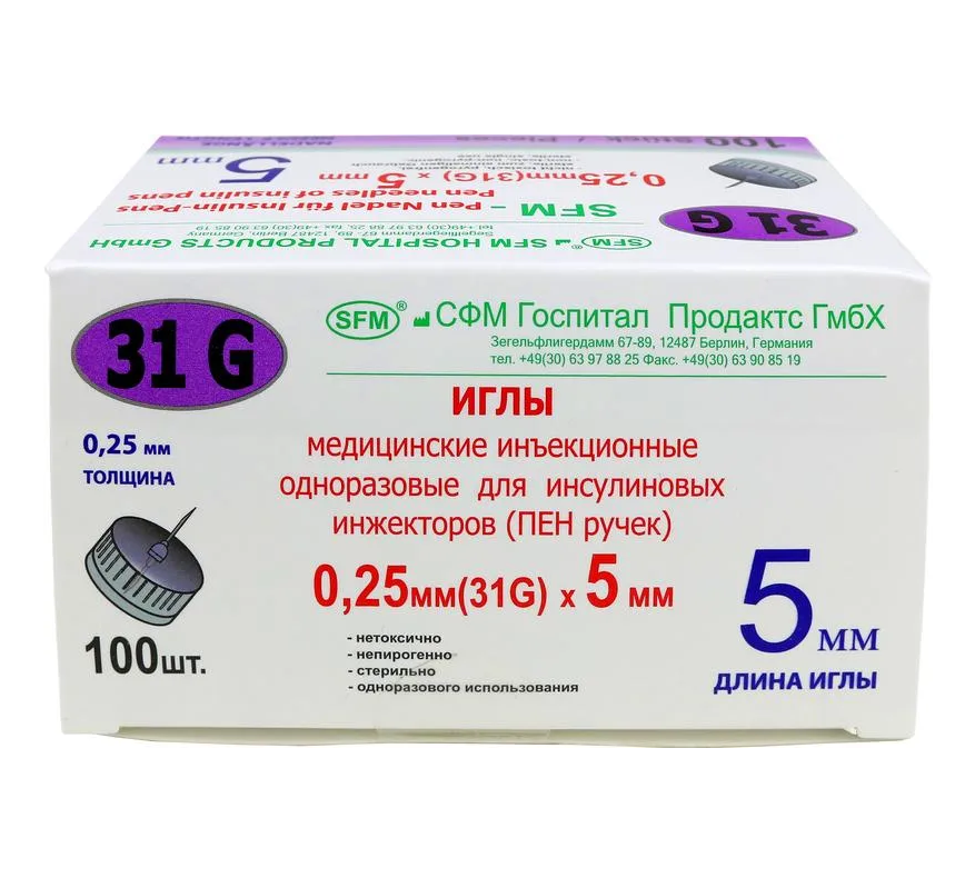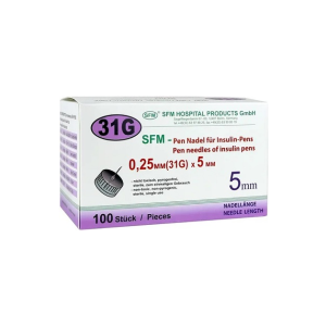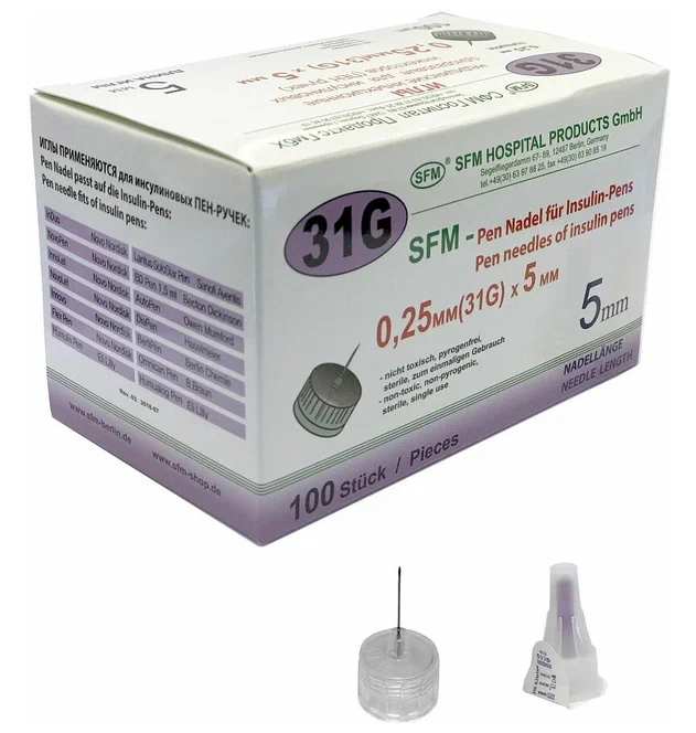 Иглы медицинские инъекционные одноразовые для инсулиновых инжекторов (ПЕН ручек) 31G (0,25ммх5мм) SFM №100