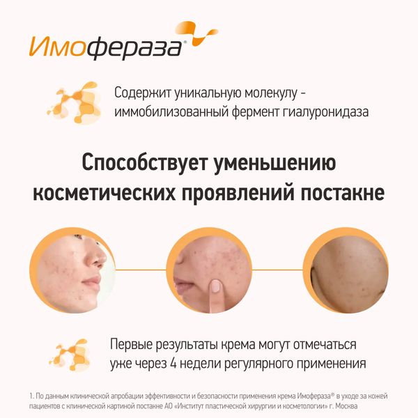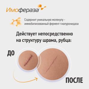 Компания ООО «НПО Петровакс Фарм», производитель оригинальных лекарственных препаратов, разработала высокоэффективное косметическое средство для специализированного ухода за кожей в области шрамов, рубцов. Активная молекула крема Имофераза® В состав крема входит фермент гиалуронидаза. Благодаря применению инновационных технологий, ученым ООО «НПО Петровакс Фарм» удалось стабилизировать фермент, который теперь обладает комплексным действием и длительным эффектом. Стабилизированная гиалуронидаза подавляет образование избыточной соединительной ткани, снижает отечность в области шрама, рубца.