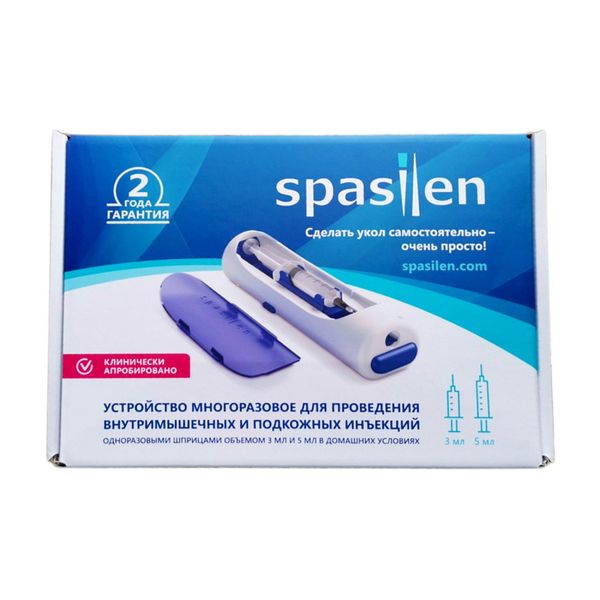 Устройство многоразовое нестерильное для проведения внутримышечных и подкожных инъекций в домашних условиях и в лечебных учреждениях. Позволяет самостоятельно проводить инъекции без специальных профессиональных навыков. Избавляет от болезненных и неприятных ощущений. Обеспечивает правильное проведение инъекции. Автоинъектор Spasilen создан, чтобы существенно уменьшить неприятные ощущения от инъекций и сделать этот процесс более комфортным как у взрослых так у детей. Производители сделали устройство настолько простым и удобным, что вы можете использовать его самостоятельно, не привлекая сторонних людей. Спасилен имеет регистрационное удостоверение Росздравнадзора № РЗН 2021/13631. Устройство многоразовое для проведения внутримышечных и подкожных инъекций в домашних условиях и в лечебных учреждениях. Изделие представляет собой компактный корпус из полимерного материала эргономичной формы с крышкой. Внутри корпуса располагаются пружинные механизмы, с помощью которых осуществляется автоматическое проведение инъекций. На боковой поверхности корпуса находится спусковая кнопка, которая приводит в действие механизмы проведения инъекции. На корпусе изделия в торцевой части рядом с отверстием для выхода иглы находится кнопка предохранителя, которая блокирует срабатывание устройства при случайном нажатии спусковой кнопки. Для установки шприцев в корпус инъектора имеются сменные картриджи для шприцев объемом 3 мл и 5 мл. Картридж со шприцем крепится на держателе картриджа, который находится внутри корпуса устройства. Для снятия колпачка с иглы шприца предусмотрен сниматель колпачка. Инъектор медицинский автоматический «Спасилен» поставляется в коробке из мелованного картона, обеспечивающем безопасную транспортировку и хранение изделия.
