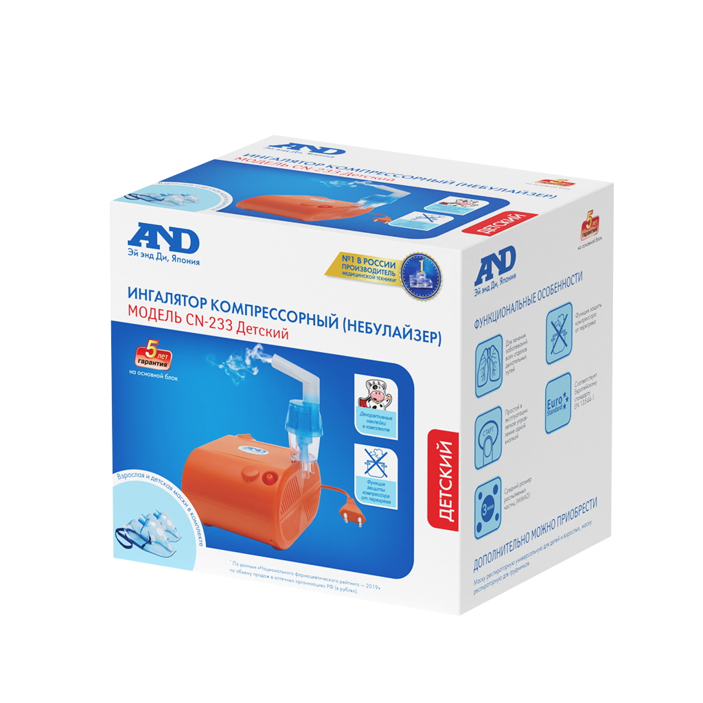 Компрессорный медицинский ингалятор AND CN-233, детский оранжевого цвета предназначен для лечения и профилактики острых и хронических респираторных заболеваний дыхательных путей.