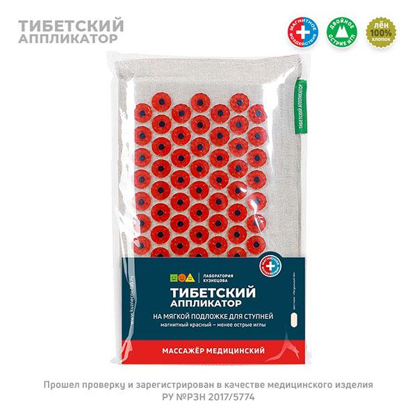 Массажер специально создан для воздействия на ступни: оптимально подобранная упругость мягкой подложки в сочетании с льняной основой и аппликаторными модулями из медицинского полистирола обеспечивают комфорт, эффективность и безопасность аппликатора. Массажер оптимального размера для воздействия на ступни. Мягкая подложка обеспечивает комфорт и равномерное прижатие игл, делает игольчатый массаж ступней приятным и эффективным. Специальные магнитные вставки усиливают лечебный эффект благодаря дополнительному воздействию постоянным магнитным полем. Красные аппликаторные модули имеют менее острые иглы.