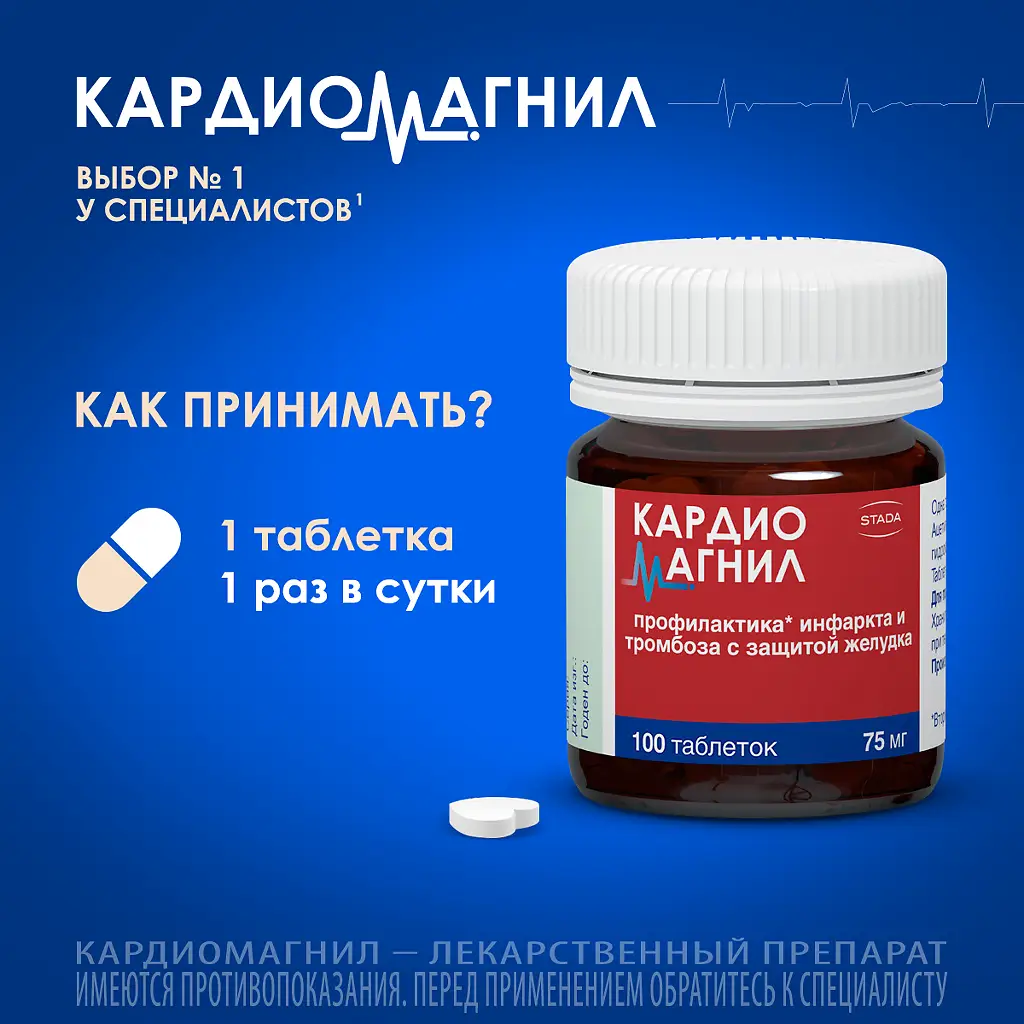 1 таблетка Кардиомагнила, содержащего АСК в дозе 75 — 150 мг 1 раз в сутки.