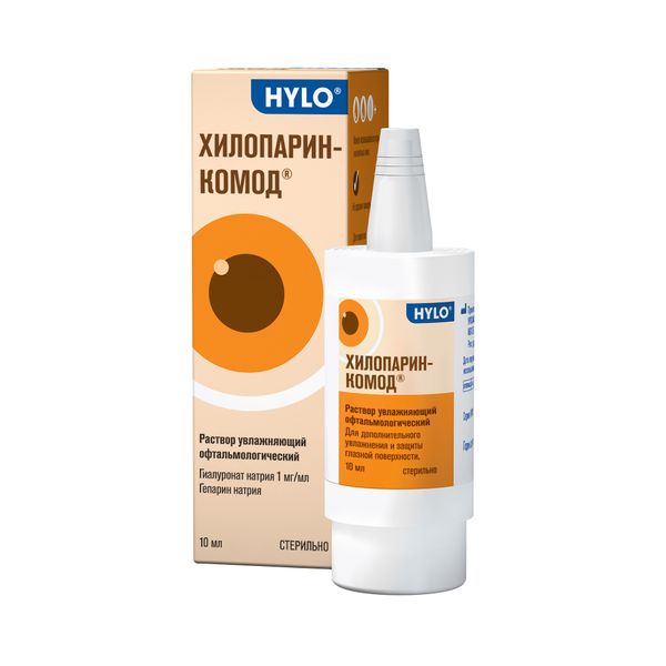 Раствор увлажняющий офтальмологический ХИЛОПАРИН-КОМОД® объединил в себе преимущества двух физиологических субстанций. Благодаря своим физическим и химическим свойствам эти вещества особенно пригодны для восстановления слезной пленки на поверхности глаза. В состав раствора ХИЛОПАРИН-КОМОД® входит натрия гиалуронат, который является природной субстанцией. Натрия гиалуронат является физиологическим полисахаридным соединением, содержащимся как в тканях глаза, так и в других тканях и жидкостях организма человека. Особым физико-химическим свойством молекул натрия гиалуроната является их выраженная способность связывать и удерживать молекулы воды в объемах, во много раз превосходящих его собственный вес. Его длинные молекулярные цепи образуют хранилища воды, а гелеобразная структура меняет вязкость, адаптируя ее к движению глазных век. Эластичность и тиксотропные свойства раствора гарантируют, с одной стороны, образование стабильной увлажняющей пленки на глазной поверхности, а с другой стороны, не затрудняют зрение в промежутках между морганиями глазных век. Водный раствор натрия гиалуроната обладает необходимой вязкостью и высокими адгезивными свойствами по отношению к передней поверхности глаза (роговице и конъюнктиве). Гепариннатриятакже является природной субстанцией, схожей по химической структуре с натрия гиалуронатом. Кроме того, химическая структура гепарина натрия имеет большое сходство с физиологическим муцином слезной пленки, он также окружензначительным объемом воды. Этисвойства гепарина натрия позволяют дополнительно поддержатьувлажняющий эффект натрия гиалуроната, создавая тем самым необходимые условия для регенерации эпителия глазной поверхности. Натрия гиалуронат и гепарин восстанавливают нормальное состояние роговицы и конъюнктивы вместе с натуральными слезами эти компоненты дополнительно увлажнят глазную поверхность. В результате образуется стабильная слезная пленка, защищающая глаз от неблагоприятных воздействий окружающей среды. Благодаря отсутствию консервантов и содержанию природных субстанций раствор ХИЛОПАРИН-КОМОД® обычно хорошо переносится.
