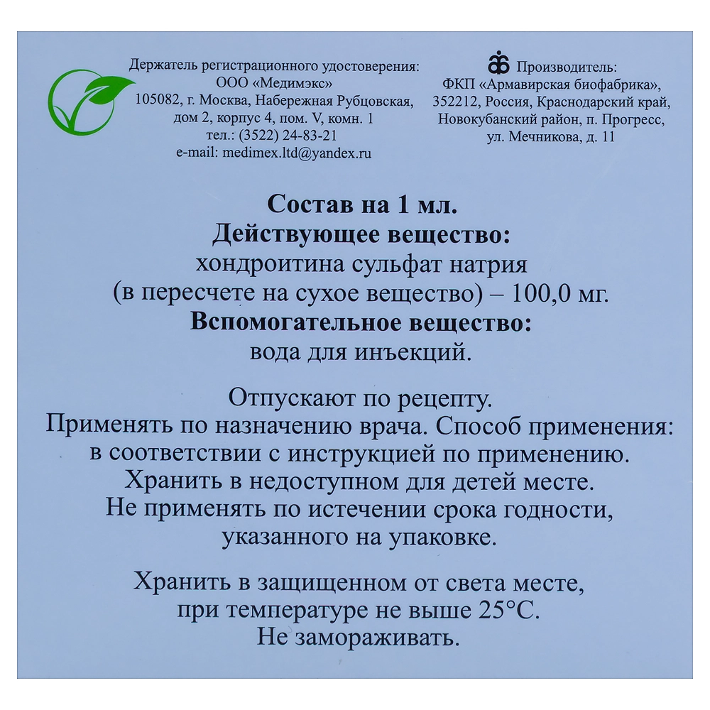 Активное вещество: хондроитина сульфат натрия (в пересчёте на сухое вещество) — 100 мг