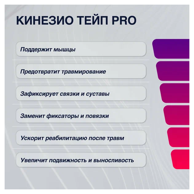 Kinexib PRO - это серия кинезио тейпов на хлопковой основе с гипоаллергенным клеевым слоем из немецких компонентов с усиленной фиксацией. Используется для повышения выносливости и снижения риска травм суставов. Применяется при ушибах мягких тканей, вывихах, хондрозах, травмах колена, мениска, локтя. А также для снятия посттравматического болевого синдрома, реабилитации и профилактики спортивных и бытовых травм. Главная особенность - увеличенная в 2 раза стойкость аппликации по сравнению с серией Classic. Не теряет свойств в воде. Держится 5-7 дней. Рулон упакован в прозрачную пленку, защищающую от влаги, посторонних запахов и вскрытия. В индивидуальной картонной коробке. Внутри - подробная инструкция с иллюстрациями.