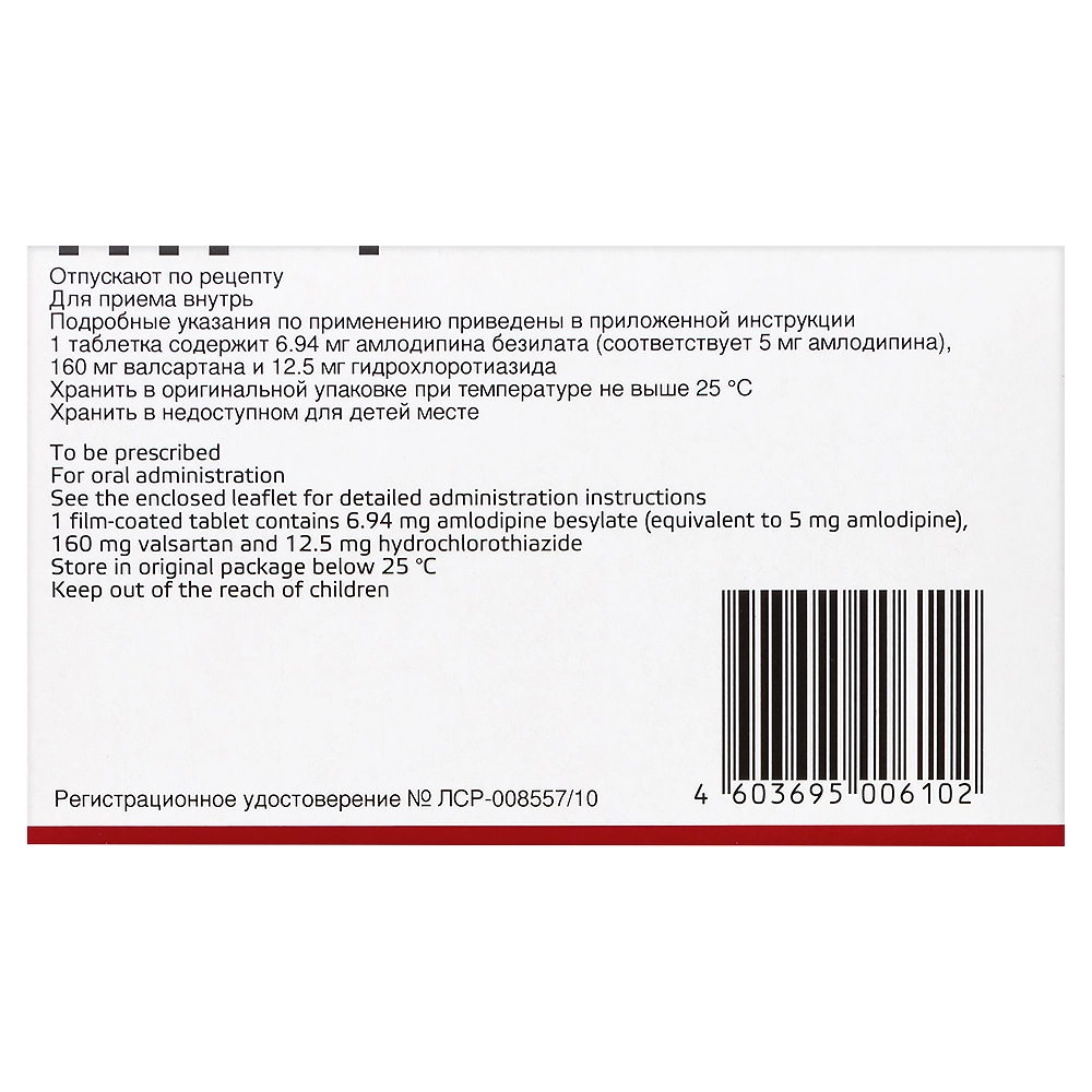 действующие вещества: амлодипина безилат — 6,94 ;мг (что соответствует 5 ;мг амлодипина основания), валсартан — 160 ;мг, гидрохлоротиазид — 12,5 ;мг; вспомогательные вещества: ;целлюлоза микрокристаллическая ;— 154,56 ;мг; ;кросповидон ;— 54,00 ;мг; ;кремния диоксид коллоидный ;— 3,00 ;мг, ;магния стеарат ;— 9,00 ;мг; оболочка плёночная: оболочка Premix белая (гипромеллоза ;— 71,43 ;%, ;титана диоксид ;— 14,29 ;%, ;макрогол ;— 7,14%, ;тальк ;— 7,14 ;%) — 14,00 ;мг.