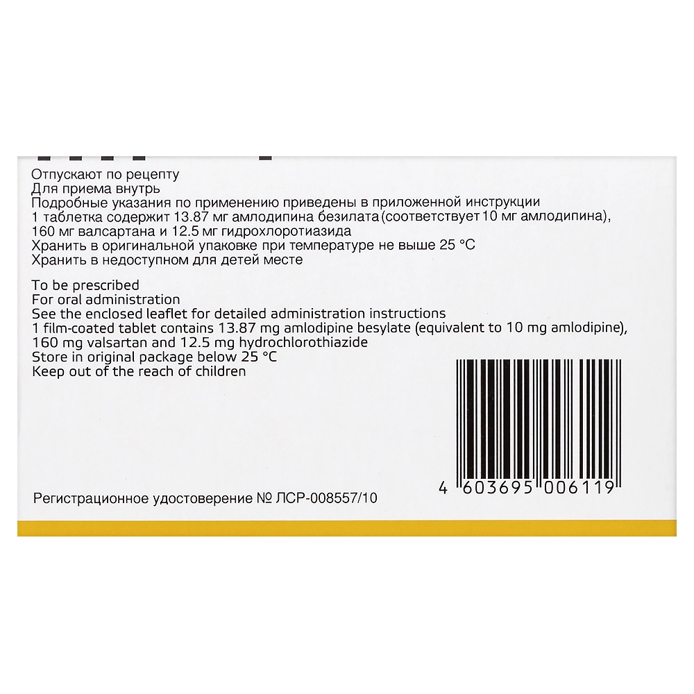 действующие вещества: амлодипина безилат — 13,87 мг (что соответствует 10 мг амлодипина основания), валсартан -160 мг, гидрохлоротиазид — 12,5 мг вспомогательные вещества: целлюлоза микрокристаллическая — 147,63 мг кросповидон — 54,00 мг кремния диоксид коллоидный 3,00 мг, магния стеарат -9,00 мг оболочка плёночная: оболочка Premix белая (гипромеллоза — 71,43 %, титана диоксид — 14,29 %, макрогол -7,14%, тальк — 7,14 %) — 13,53 мг, оболочка Premix жёлтая (гипромеллоза -71,43 %, краситель железа оксид желзый — 14,29 %, макрогол — 7,14%, тальк -7,14 %) — 0,45 мг, оболочка Premix красная (гипромеллоза — 71,43 %, краситель железа оксид красный -14,29 %, макрогол — 7,14%, тальк -7,14%) — 0,02 мг.