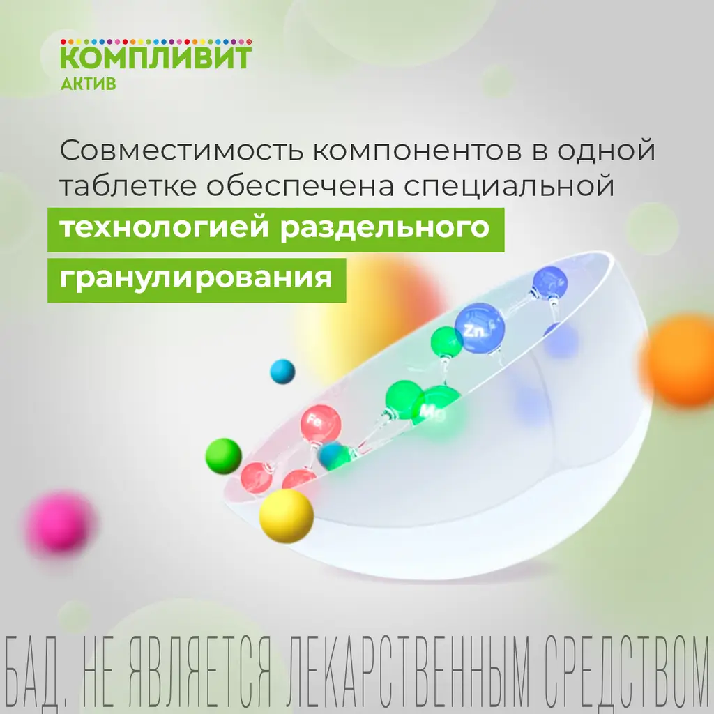 БАД к пище «Компливит® Актив» является дополнительным источником витаминов А, С, Е, D (в 1 таблетке 200 МЕ), группы В (В1, В2, В3, В5, В6, В12, фолиевой кислоты), минеральных элементов (железа, меди, цинка, селена, йода, марганца), содержащей магний.