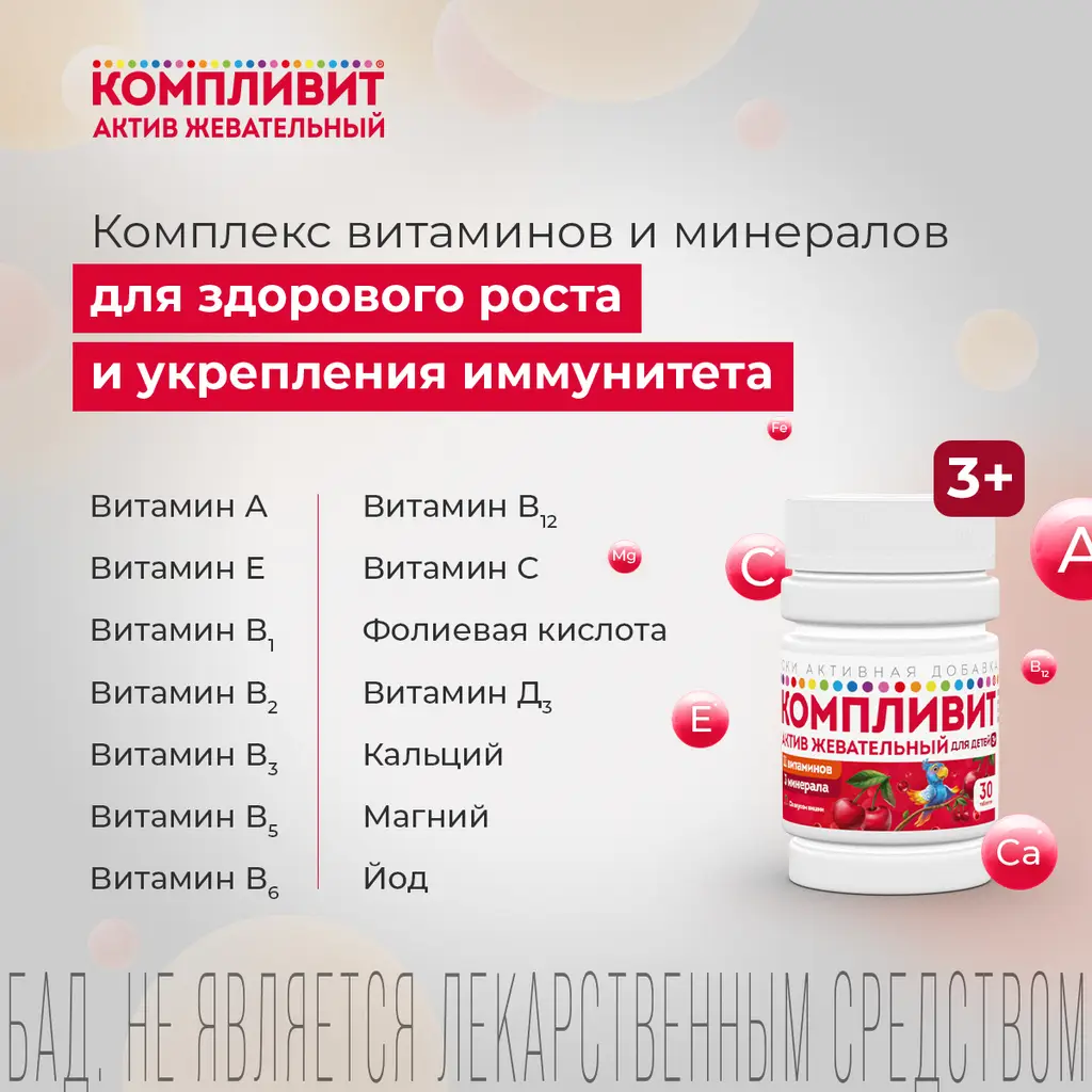 Биологически активная добавка к пище "Компливит Актив жевательный" является дополнительным источником витаминов А, С, Е, D (в 1 таблетке - 60 МЕ), группы В (В1, В2, В3, В5, В6, В9, В12), минеральных элементов (магния, кальция, йода).