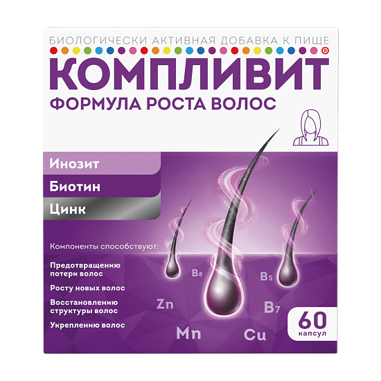 «КОМПЛИВИТ® Формула роста волос» рекомендуется в качестве биологически активной добавки к пище - дополнительного источника витаминов (С, Е, А, В5, В6, биотина), инозита и минеральных веществ (цинка, меди, марганца), комплексно способствующих поддержанию нормального состояния волос и снижению риска их выпадения.