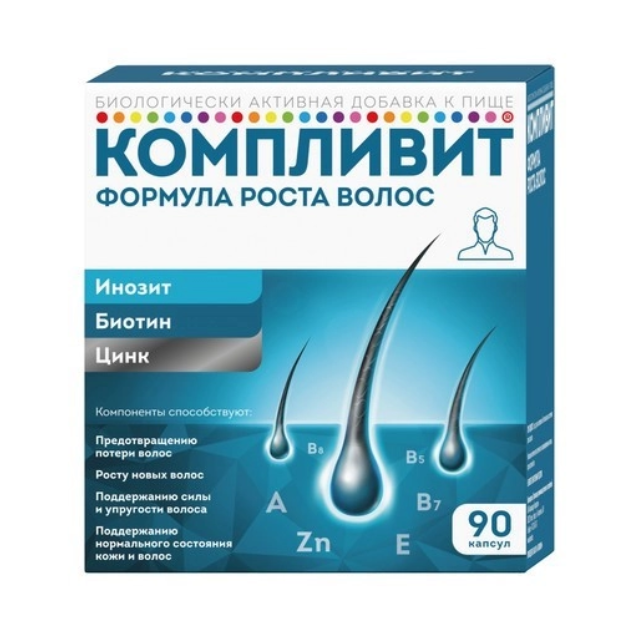 «КОМПЛИВИТ® Формула роста волос» рекомендуется в качестве биологически активной добавки к пище - дополнительного источника витаминов (С, Е, А, В5, В6, биотина), инозита и минеральных веществ (цинка, меди, марганца), комплексно способствующих поддержанию нормального состояния волос и снижению риска их выпадения.