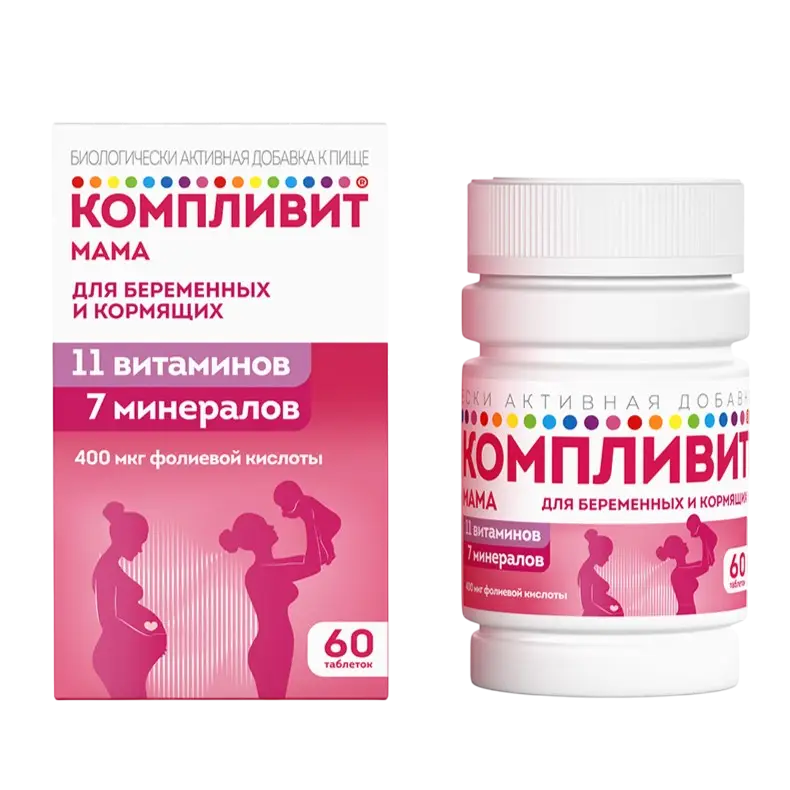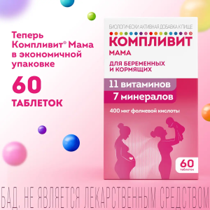 БАД «Компливит® «Мама» для беременных и кормящих» представляет собой комплекс витаминов и минералов, предназначенный для снижения риска гиповитаминоза и дефицита минеральных веществ во время беременности и грудного вскармливания.