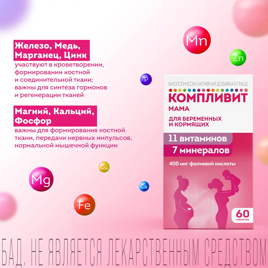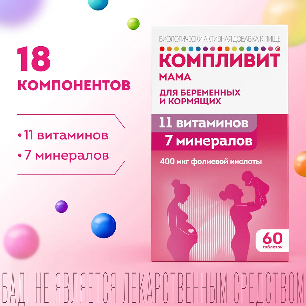 Комплекс содержит 11 витаминов, 7 минералов, данный комплекс создан с учетом потребностей женщин в витаминах и минералах во время беременности, в период кормления грудью. Совместимость компонентов, входящих в состав БАД «Компливит® «Мама» для беременных и кормящих», обеспечена специальной технологией.