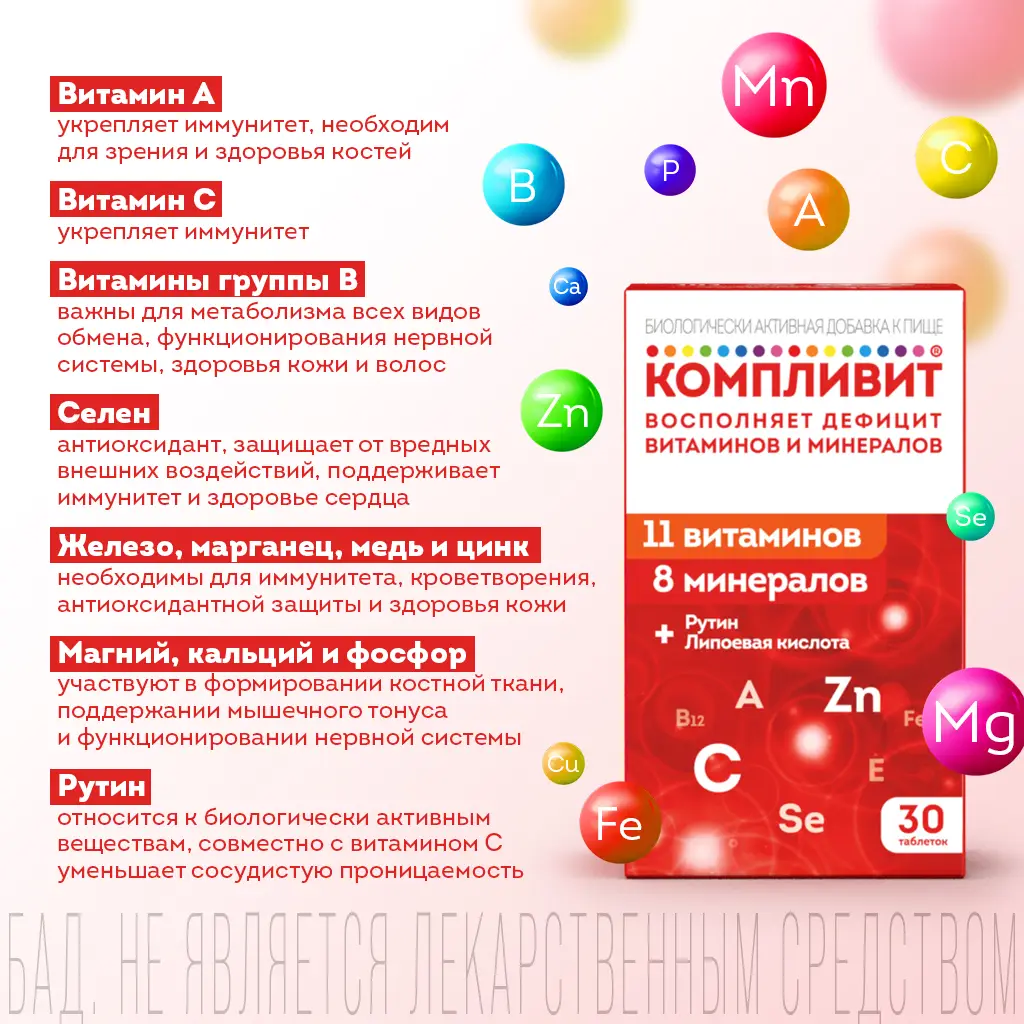 Биологически активная добавка к пище «Компливит®» является дополнительным источником витаминов А, Е, С, группы В (В1, В2, В3, В5, В6, В12, фолиевой кислоты, биотина), минеральных элементов (железа, марганца, меди, цинка, магния, селена), источником рутина и липоевой кислоты.