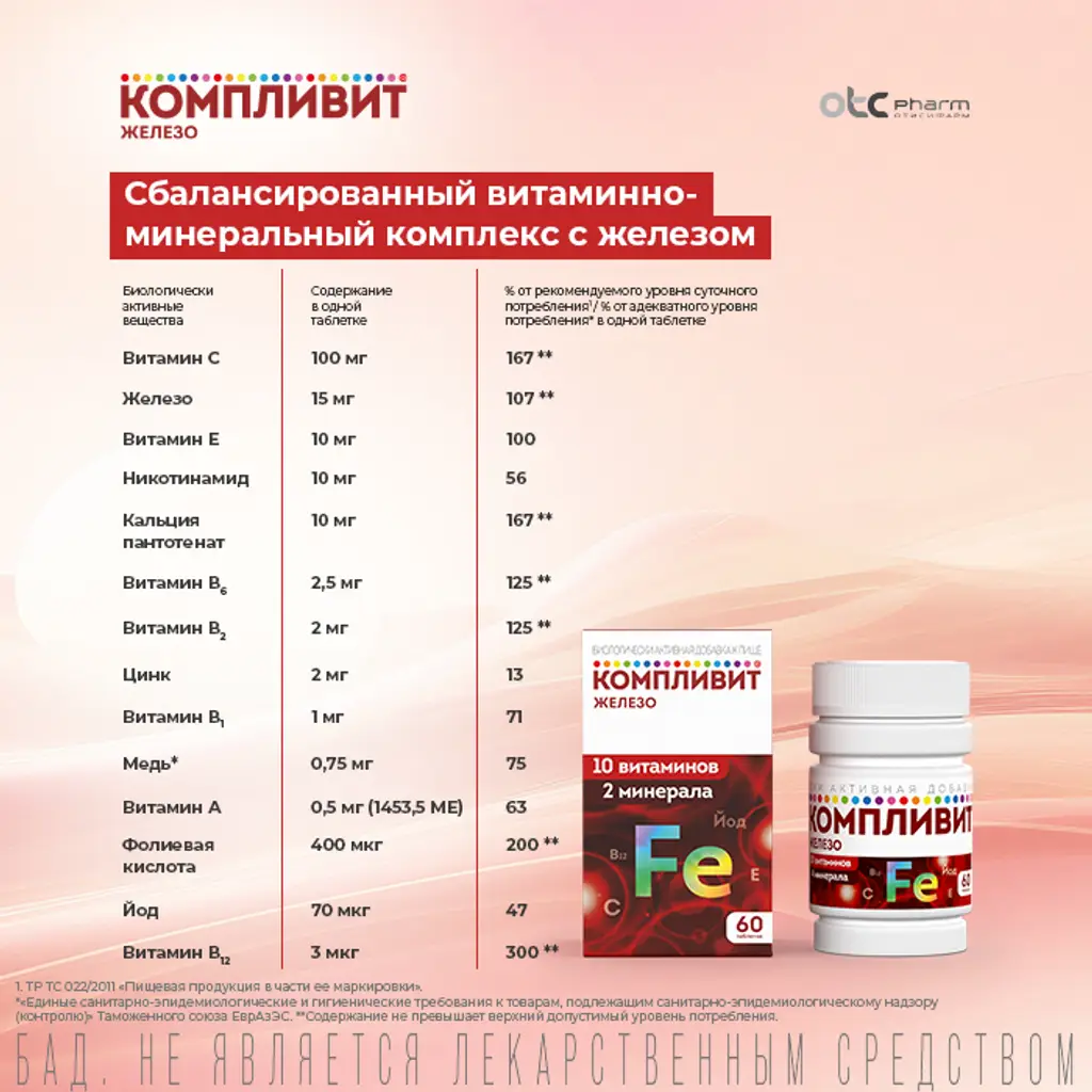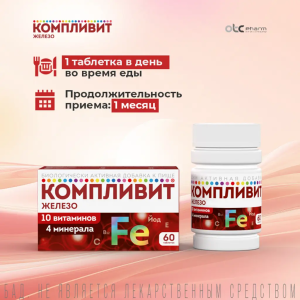 КОМПЛИВИТ® ЖЕЛЕЗО является источником витаминов и минеральных веществ. Отличительной особенностью КОМПЛИВИТ® ЖЕЛЕЗО является содержание суточной физиологической дозы железа (в форме железа фумарата). Железо является жизненно необходимым элементом для организма. Входит в состав гемоглобина, участвует в процессах тканевого дыхания. Железо необходимо для формирования костей, нервной системы, для работы желудочно-кишечного тракта, эндокринных желез, нормального функционирования иммунной системы. Дефицит железа может приводить к анемии.