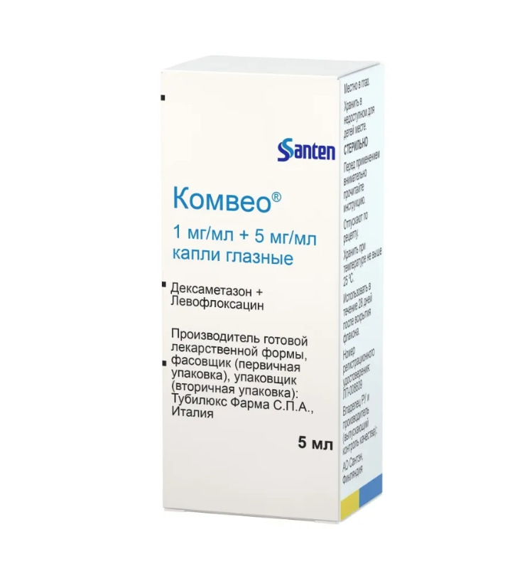 Сто двадцать пять пациентов, перенёсших хирургическую операцию по удалению катаракты, были рандомизированы на 3 группы: левофлоксацин, дексаметазон и препарат Комвео®. Одна капля каждого препарата вводилась за 60 и 90 минут до лимбального парацентеза роговицы. Среднее значение полученных концентраций левофлоксацина составило 711,899 нг/мл (95% ДИ: 595,538 828,260) в группе препарата Комвео® по сравнению с 777,307 нг/мл (95% ДИ: 617,220 937,394) при введении левофлоксацина отдельно. Концентрации левофлоксацина в водянистой влаге глаза значительно превышают минимальные подавляющие концентрации для патогенных микроорганизмов, входящих в спектр действия левофлоксацина.