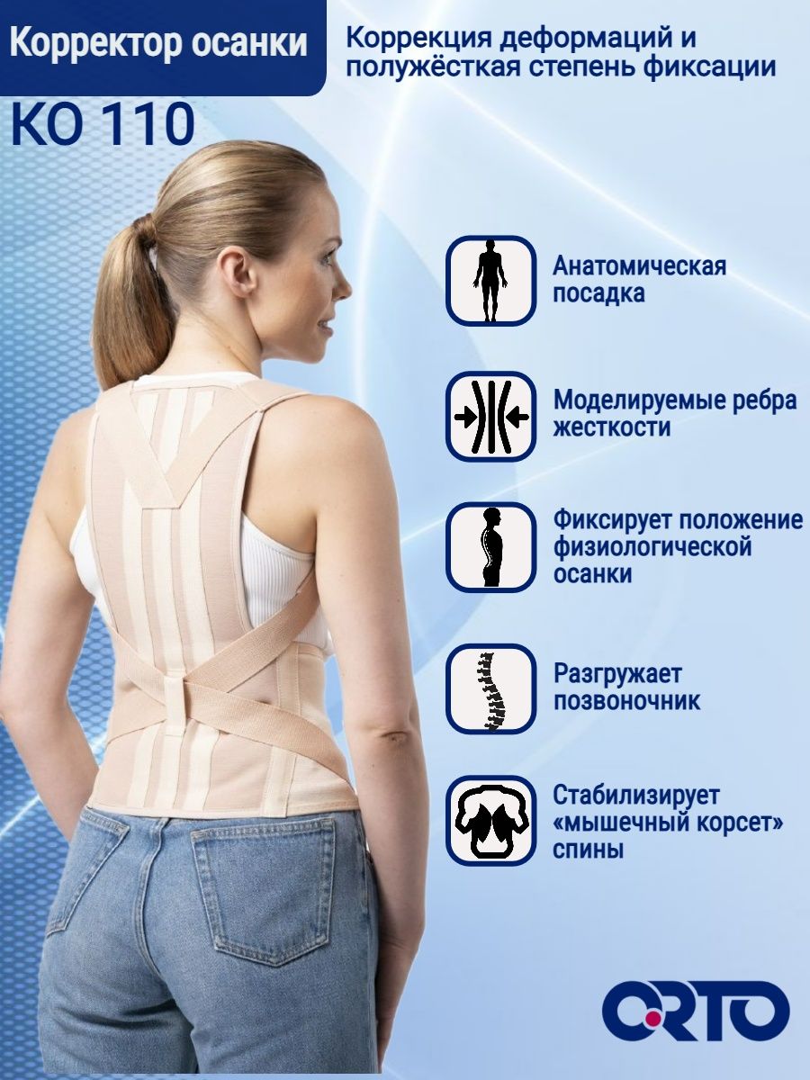 Ортез ORTO КО 110 с разъёмной основой анатомической формы, нерастяжимой центральной частью и эластичными боковыми частями. Фиксирующие элементы представлены в виде двух моделируемых рёбер жёсткости, расположенных вдоль позвоночника. Элементы коррекции ― реклинирующие ремни ― прикреплены к основе и снабжены смягчающими вставками, обеспечивающими комфорт в процессе ношения. В центральной части основы располагается шлёвка для удержания реклинирующих ремней. По краям боковых частей основы и на реклинирующих ремнях расположены застёжки «Велкро».