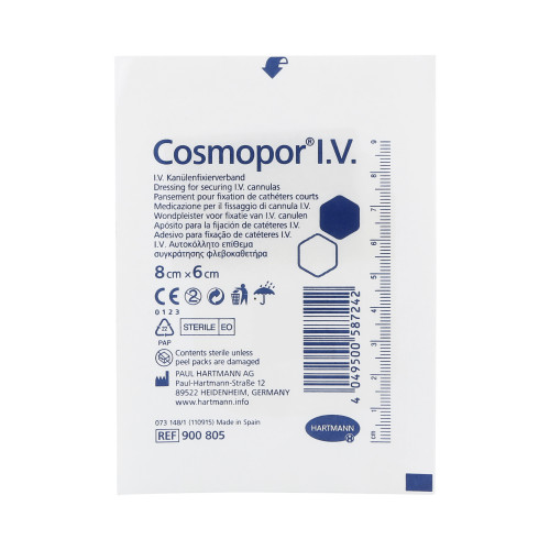 Самоклеящиеся повязки для фиксации катетеров и канюль Cosmopor I.V. применяются для фиксации катетера или канюль. Фиксация инструмента позволит избавить пациента от необходимости новых проколов для инъекций. Катетер может быть установлен на срок до месяца. На этот период следует обеспечить контроль за состоянием места введения канюли, надежное крепление, исключающее повороты, выпадение или травмирование тканей и органов, а также исключить возникновение раздражения и аллергических реакций в месте крепления повязки.
