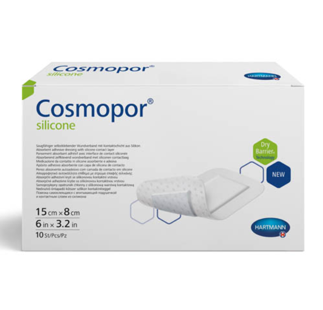 Повязка впитывающая пластырного типа с контактным слоем из силикона Cosmopor® silicone/Кocмonop силикон. Cosmopor® silicone/Кocмoпop силикон представляет собой неактивную одноразовую самоклеящуюся стерильную и полупроницаемую повязку на рану (гидроцеллюлярную тонкую повязку), состоящую из нетканого материала основы (материала-носителя) и впитывающей подушечки для раны. Обе части повязки покрыты силиконовым клеевым перфорированным слоем и защищены пленкой.