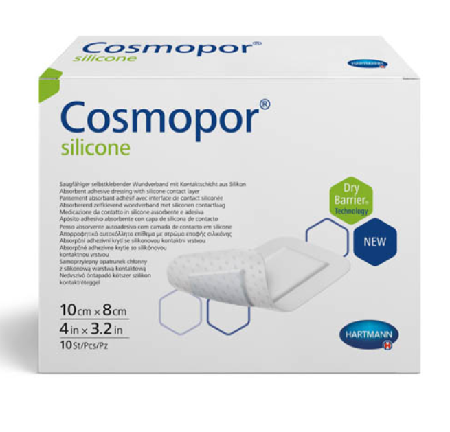 Повязка впитывающая пластырного типа с контактным слоем из силикона Cosmopor® silicone/Кocмonop силикон. Cosmopor® silicone/Кocмoпop силикон представляет собой неактивную одноразовую самоклеящуюся стерильную и полупроницаемую повязку на рану (гидроцеллюлярную тонкую повязку), состоящую из нетканого материала основы (материала-носителя) и впитывающей подушечки для раны. Обе части повязки покрыты силиконовым клеевым перфорированным слоем и защищены пленкой.