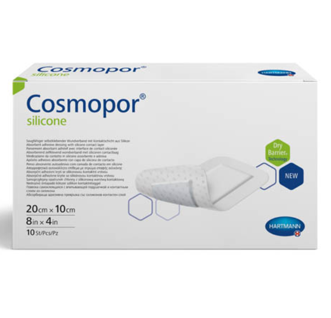 Повязка впитывающая пластырного типа с контактным слоем из силикона Cosmopor® silicone/Кocмonop силикон. Cosmopor® silicone/Кocмoпop силикон представляет собой неактивную одноразовую самоклеящуюся стерильную и полупроницаемую повязку на рану (гидроцеллюлярную тонкую повязку), состоящую из нетканого материала основы (материала-носителя) и впитывающей подушечки для раны. Обе части повязки покрыты силиконовым клеевым перфорированным слоем и защищены пленкой.