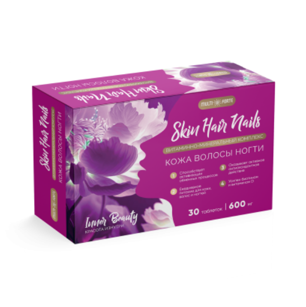 Рекомендуется в качестве биологически активной добавки к пище обеспечивающей ежедневное питание для кожи, волос и ногтей, способствующей восполнению недостатка витаминов и микроэлементов способствующей обновлению клеток кожи и повышению ее упругости, выравниванию тона кожи, придающей коже сияющий и здоровый вид активные вещества в составе способствуют приданию блеска волосам, профилактике ранней седины, активизации обменных процессов в волосяных луковицах, помогают повысить прочность волос и ногтей, укрепляют и ускоряют их рост витаминный комплекс оказывает активное антиоксидантное действие, способствует сдерживанию процессов старения кожи, волос и ногтей.
