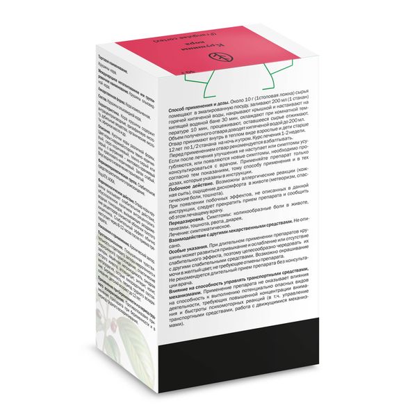 Отвар коры крушины оказывает слабительное действие, обусловленное наличием антра- ценпроизводных гликозидов, вызывающих раздражение рецепторов слизистой оболочки толстого кишечника. Слабительный эффект обычно наступает через 8–12 часов после приёма препарата.