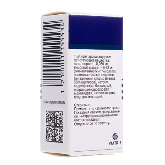 активные вещества: латанопрост — 50 мкг, тимолола малеат — 6,83 мг (эквивалентно 5 мг тимолола)