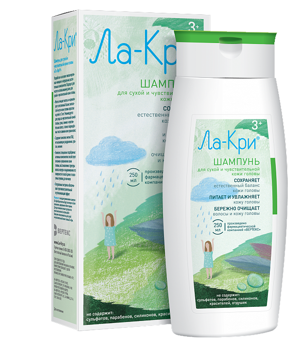 Шампунь Ла-Кри для сухой и чувствительной кожи головы предназначен для мягкого очищения волос, нормализации естественного баланса волосистой части кожи головы взрослых и детей от 3 лет.