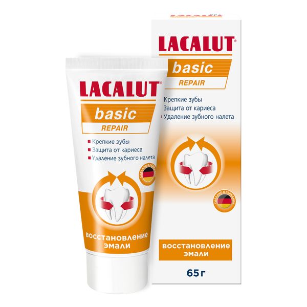 Зубная паста LACALUT basic repair обеспечивает комплексное здоровье полости рта, восстановление и укрепление эмали. Эффективная комбинация аминофторида и фторида натрия ускоряет реминерализацию эмали и защиту от кариеса, антисептик снижает образование бактериального зубного налета, а мягкий абразив удаляет его и полирует эмаль.
