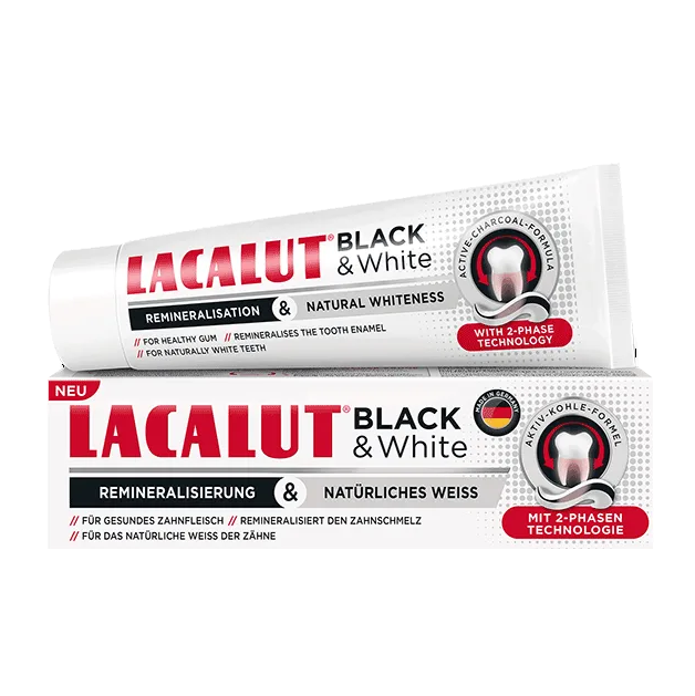 Зубная паста Lacalut black&white c порошком древесного угля безопасно и тщательно очищает зубную эмаль от налета, реминерализует эмаль, полирует ее поверхность и обеспечивает гладкость на долгое время. Отбеливающий комплекс пирофосфатов и мягких абразивов осветляет зубную эмаль благодаря удалению зубного налета с поверхности эмали. Гидроксиапатит и фторид натрия реминерализуют эмаль, восстанавливают ее внешние слои и защищают от кариеса. Лактат алюминия и хлоргексидин заботится о деснах и предотвращает их воспаление.