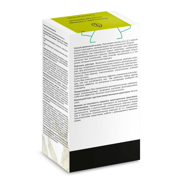 Принимают по 1/2 -1 чайной ложке 1 раз в день, запивая водой. Курс лечения 15–30 дней.