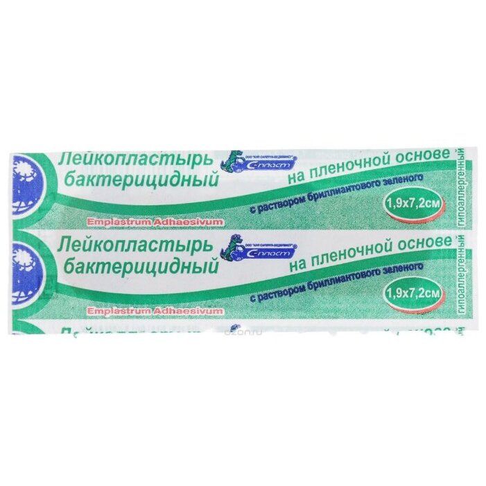 лейкопластырь бактерицидный на пленочной основе с раствором бриллиантового зеленого 1,9х7,2 см №2 (отпуск 100шт)