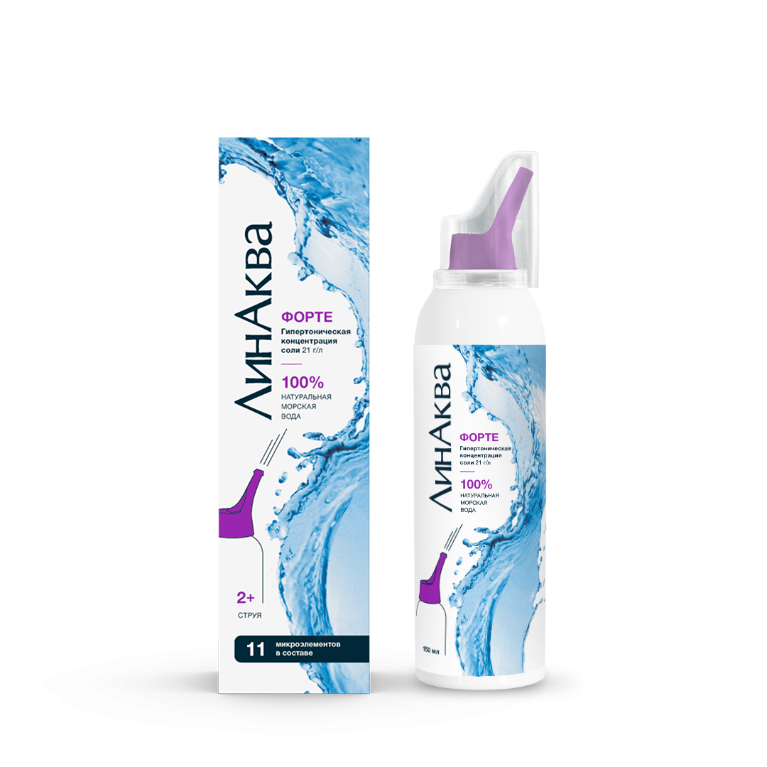 Средство для промывания и орошения полости носа для детей и взрослых «ЛинАква форте» (далее – Средство), прозрачная бесцветная жидкость без запаха. Гипертоническая натуральная стерильная морская вода с содержанием натрия хлорида (NaCl) 21 г/л. Содержит все активные вещества и микроэлементы морской воды: К, Mg, Na, Са, Cl, Se, I, Zn, Cu, Fe и др. Не содержит консервантов.