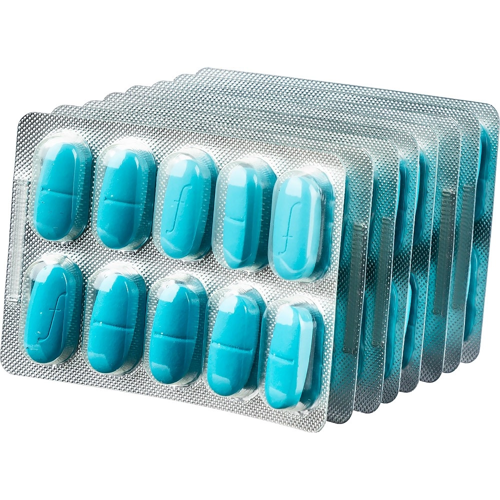 Таблетки овальной, двояковыпуклой формы, покрытые плёночной оболочкой голубого цвета с перламутровым эффектом, с риской на одной стороне и символом "f" — с другой. На поперечном срезе — ядро белого или почти белого цвета.