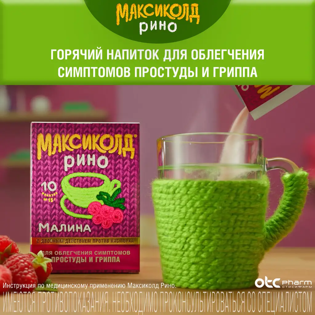Максиколд Рино порошок для приготовления раствора для приема внутрь с ароматом малины 325мг+10мг+20мг+50мг пакетики 15г №10