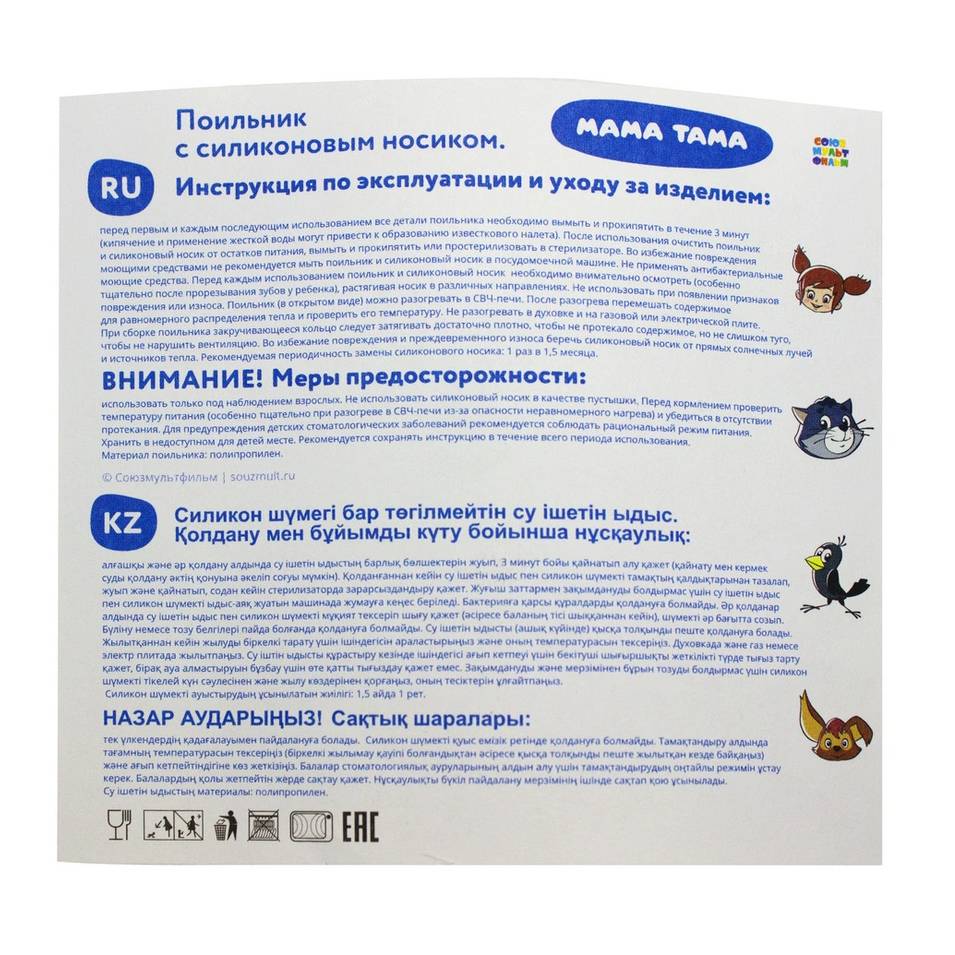 Поильник с силиконовой трубочкой предназначен для воды и других напитков для детей с 12 месяцев.