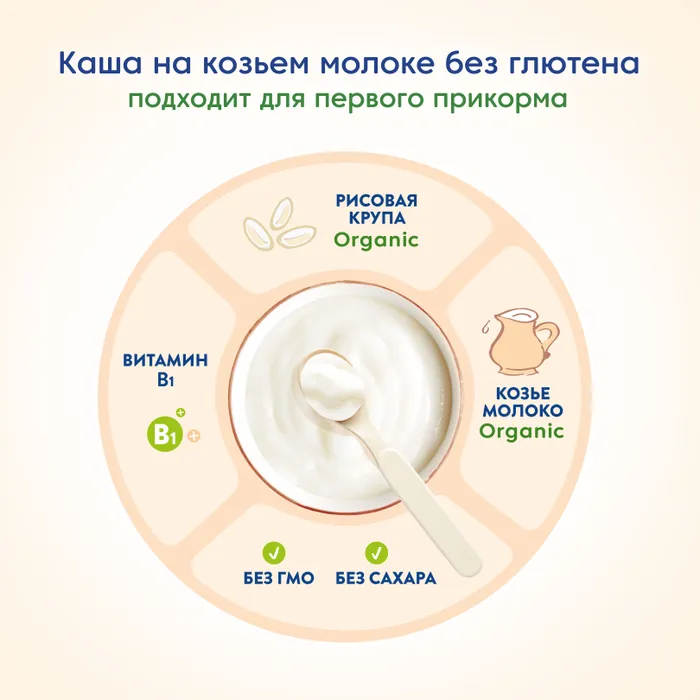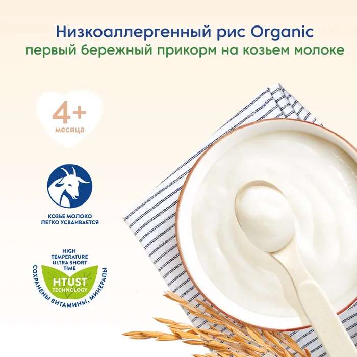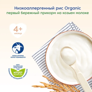 Рисовая крупа, козье молоко (32 %), минералы (карбонат кальция, йодид калия, пирофосфат железа, сульфат цинка), витамины (A, D3, E, K1, C, B1, B2, ниацин, B6, фолиевая кислота, пантотеновая кислота, B12, биотин). Без ГМО.