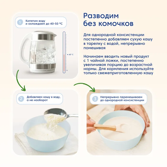 Вымойте руки. Вскипятите 120мл воды, охладите до 40-50°С, налейте в чистую посуду. В отдельную чистую посуду насыпьте 40г (5 ст.ложек) сухой каши. Постепенно добавляйте сухую кашу в тарелку с водой, непрерывно перемешивая до получения однородной консистенции. Остудите кашу до температуры 37°С.