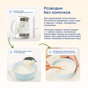 Важно! Перед введением нового прикорма проконсультируйтесь с вашим педиатром. Начинайте вводить новый продукт с небольшого количества, постепенно увеличивая порцию до возрастной нормы. Для кормления используйте только свежеприготовленную кашу. Оставшаяся после кормления порция не подлежит использованию.
