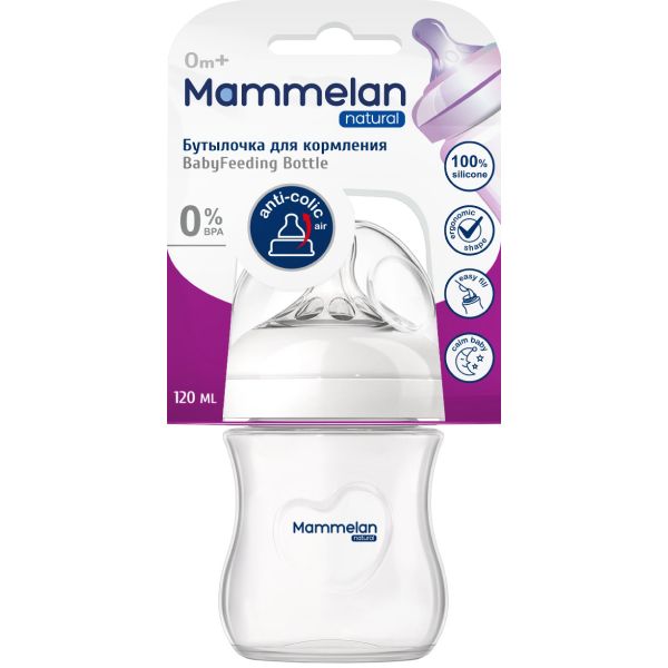 Mammelan бутылочка для кормления противоколиковая с силиконовой соской и широким горлом 0+ 120мл