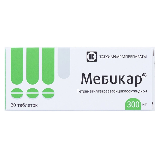 Действующее вещество Мебикара® тетраметилтетраазабициклооктандион по химической структуре является близким к естественным метаболитам организма — его молекула состоит из двух метилированных фрагментов мочевины, входящих в состав бициклической структуры.