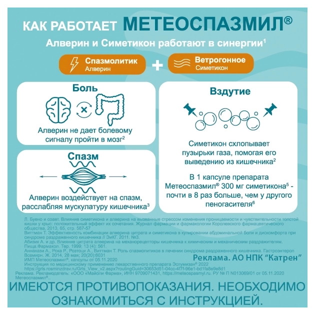 Действующие вещества: Альверина цитрат - 60 мг, Симетикон - 300 мг.