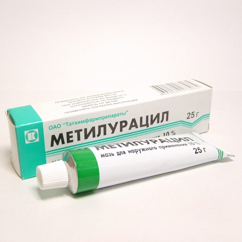 Действующее вещество: диоксометилтетрагидропиримидин (метилурацил) — 10 г.