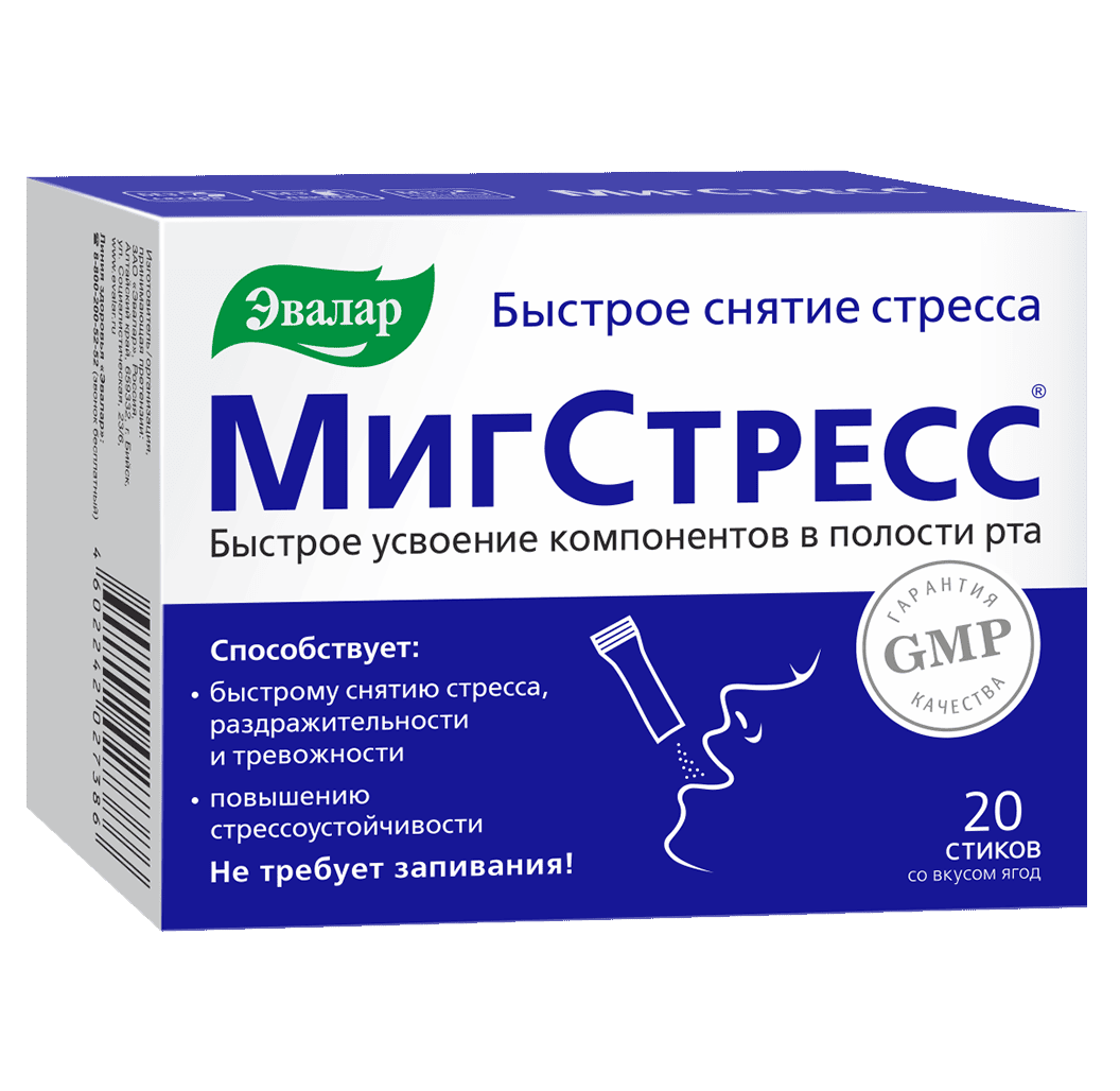 «МигСтресс» от компании «Эвалар» – это инновационное и эффективное современное средство для максимально быстрого снятия стресса в удобной и легкодоступной форме порошка для рассасывания. Всего 1 стик – чтобы быстро успокоиться, вернуть самообладание и контроль над эмоциями.