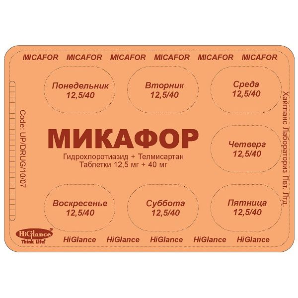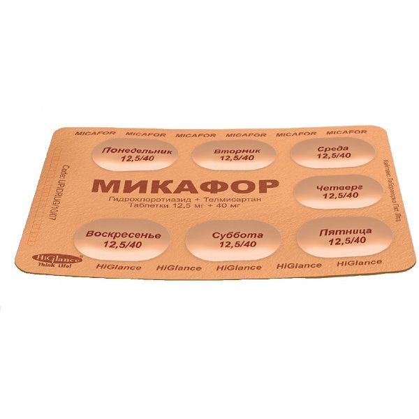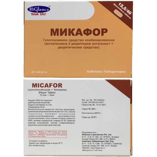 Препарат МИКАФОР представляет собой комбинацию телмисартана (антагониста рецепторов ангиотензина II) и гидрохлоротиазида (тиазидного диуретика). Одновременное применение этих компонентов приводит к более выраженному антигипертензивному эффекту, чем применение каждого из них в отдельности.