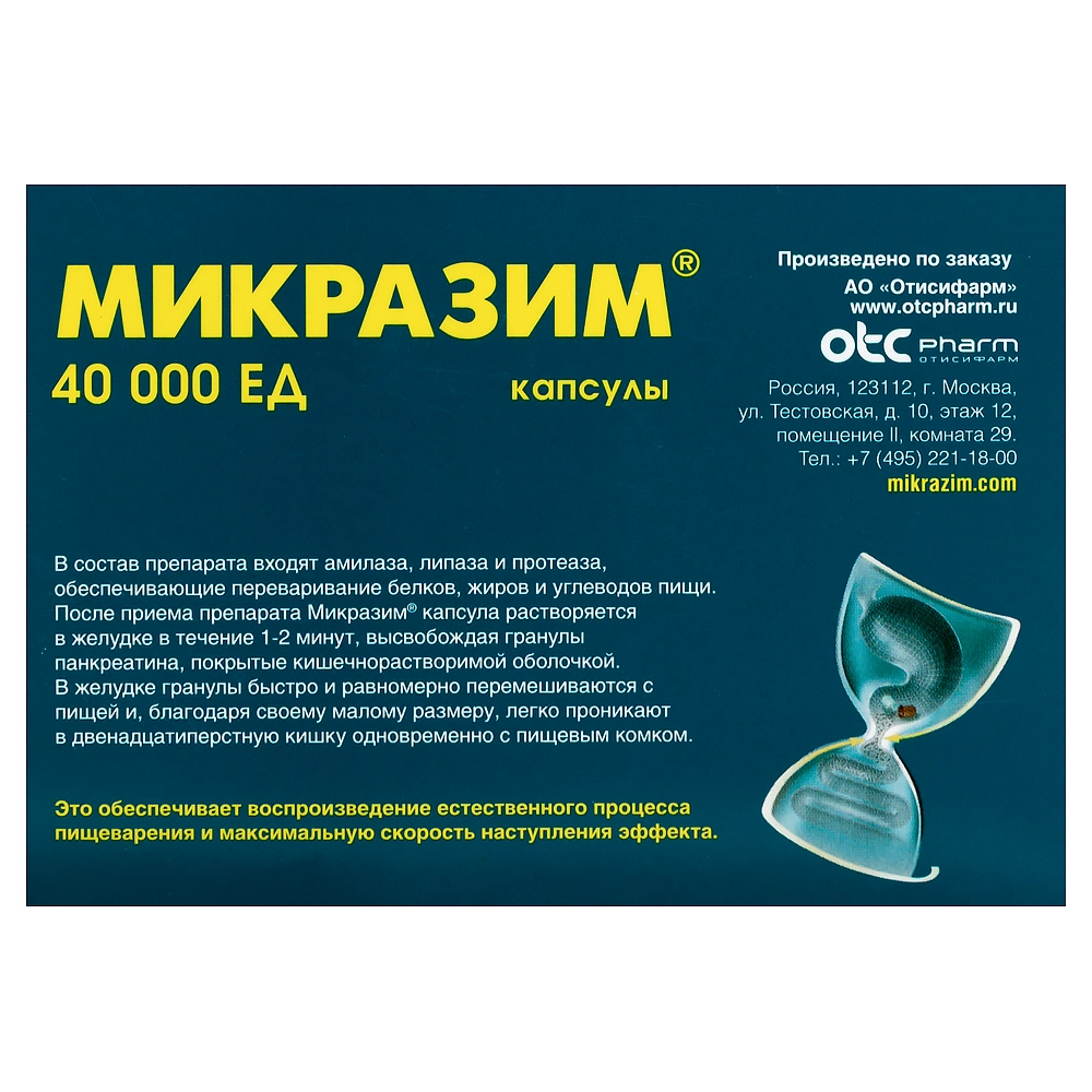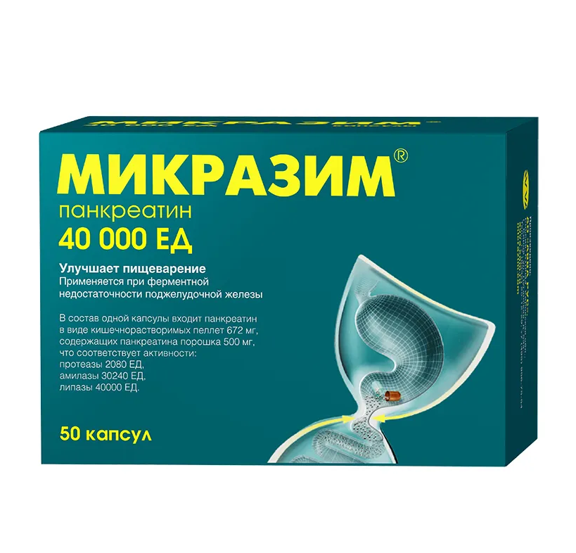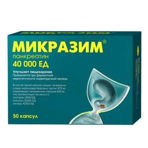 Микразим® — микрогранулированный панкреатин в капсулах. В состав препарата входят ферменты — протеаза, липаза и амилаза, обеспечивающие переваривание белков, жиров и углеводов пищи. После приёма препарата Микразим®, желатиновая капсула растворяется в желудке в течение 1–2 минут, высвобождая микрогранулы панкреатина, покрытые кишечнорастворимой оболочкой. В желудке микрогранулы быстро и равномерно перемешиваются с пищей и, благодаря своему малому размеру, легко проникают в двенадцатиперстную кишку одновременно с пищевым комком. Это обеспечивает воспроизведение естественного процесса пищеварения, и максимальную скорость наступления эффекта.