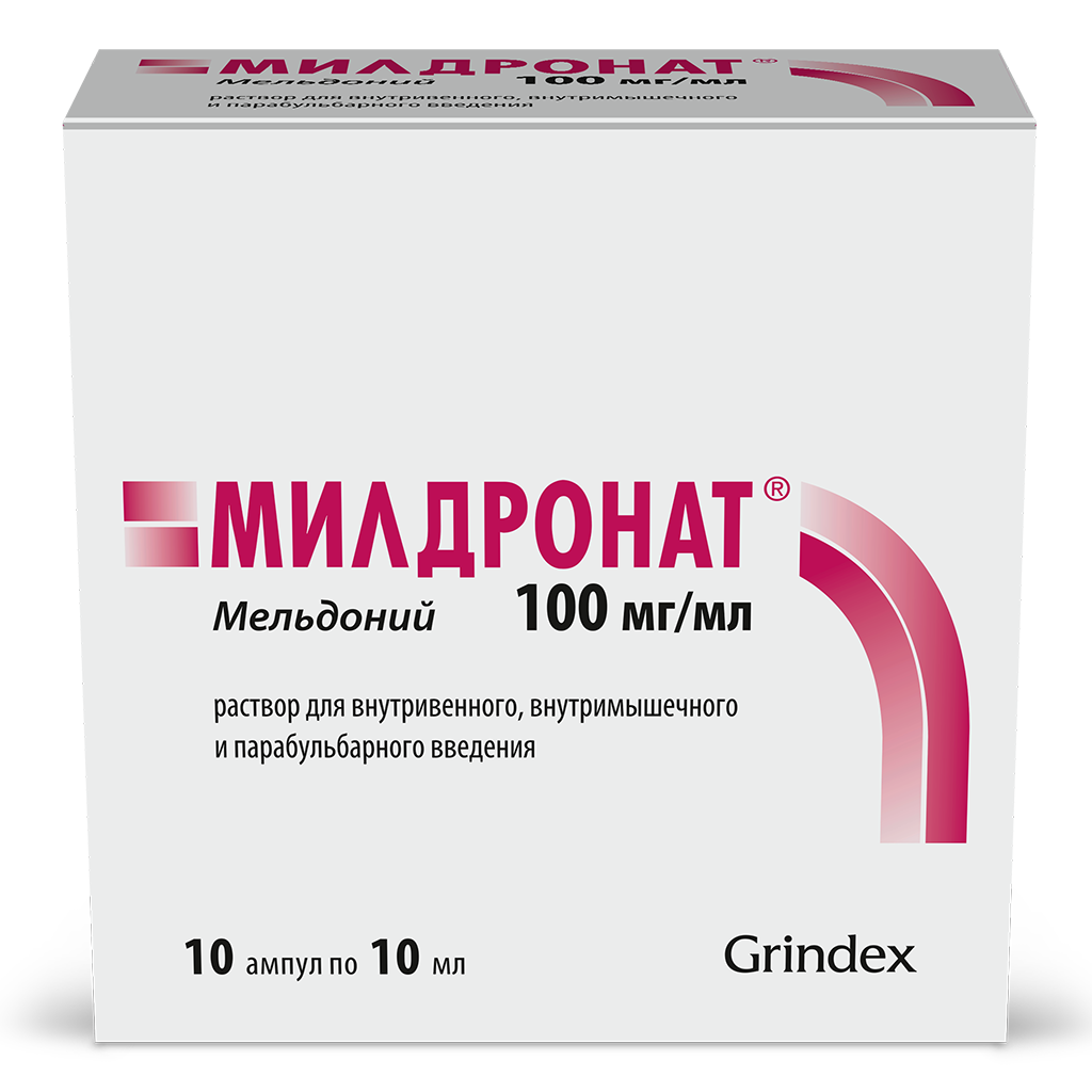 Милдронат раствор для внутривенного, внутримышечного и парабульбарного введения 100мг/мл ампулы 10мл №10